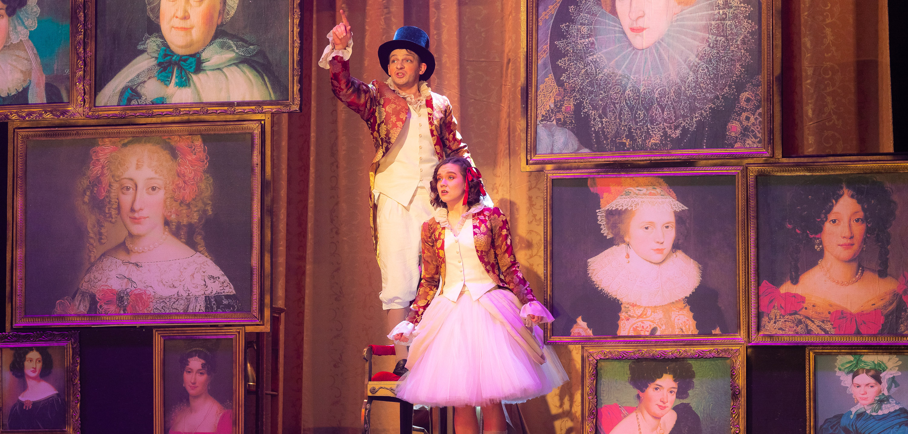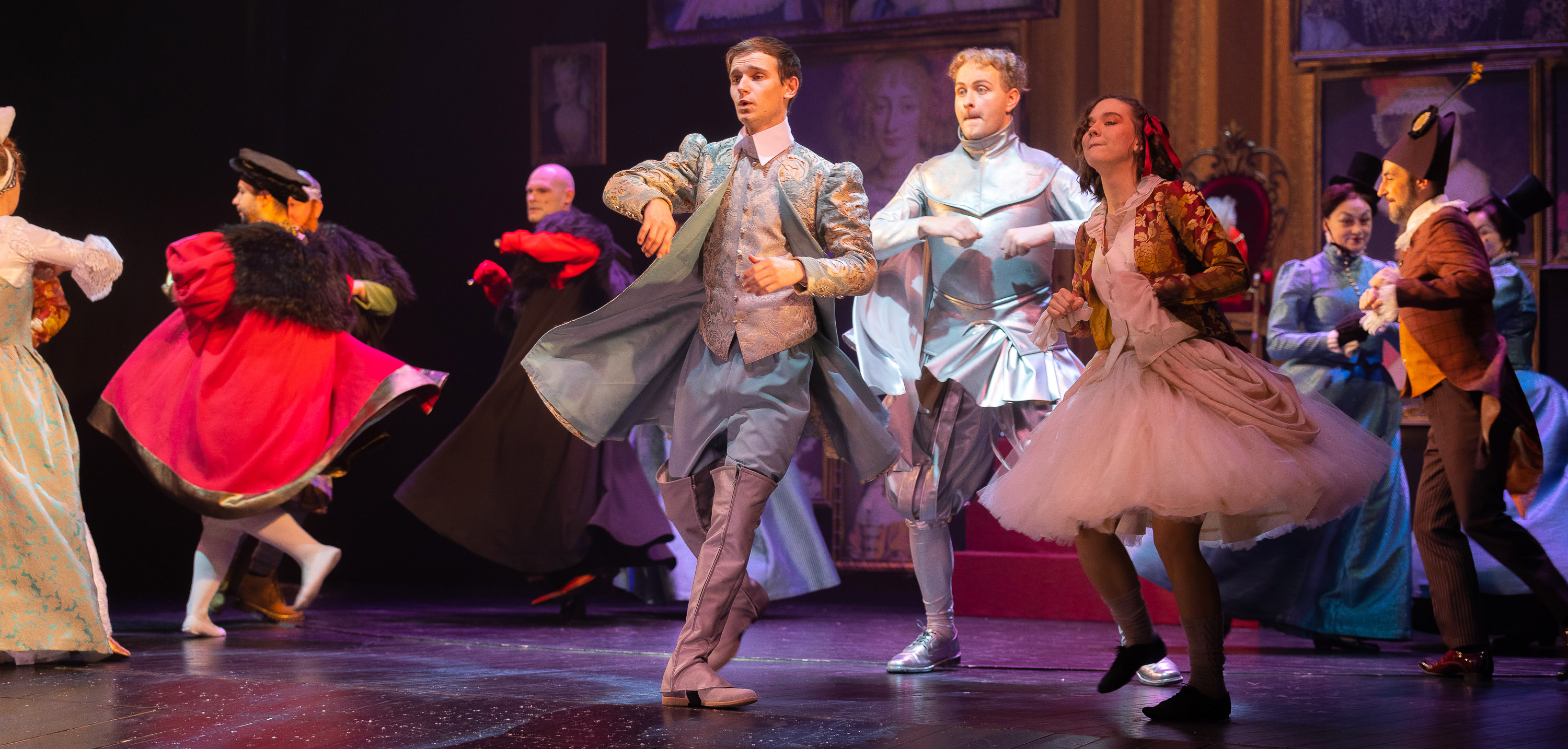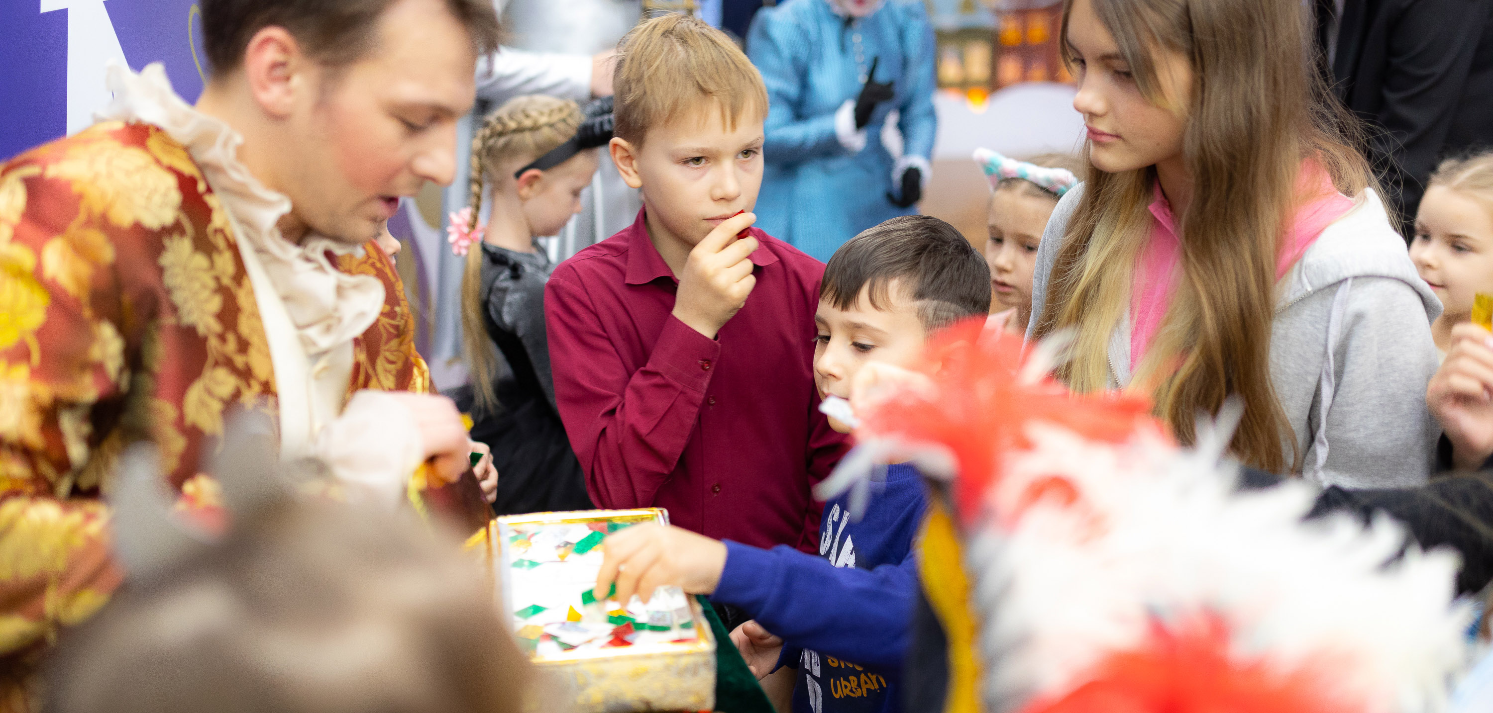 С уважением к театральному этикету и с учетом праздничного повода, все пришли невероятно красивыми и нарядными, а детвора и вовсе облачилась в костюмы любимых сказочных героев. Не успели мы согреться с уличного мороза, как на встречу к самым маленьким участникам мероприятия, как по волшебству вышли: шут, принц и фрейлина. Они моментально приковали к себе внимание и детей, и взрослых. И так как главный сюжет повествования о тайне королевы Берты происходит в замке, то юному зрителю было предложено разучить придворный танец и освоить дворцовый поклон для настоящих принцесс и принцев. Как завороженные, дети повторяли за актерами, улавливая каждый их жест и движение, следуя бальному ритму музыки. А еще были щедрые предсказания на грядущий год в стихах от романтичного поэта и забавные задания от веселого шута.