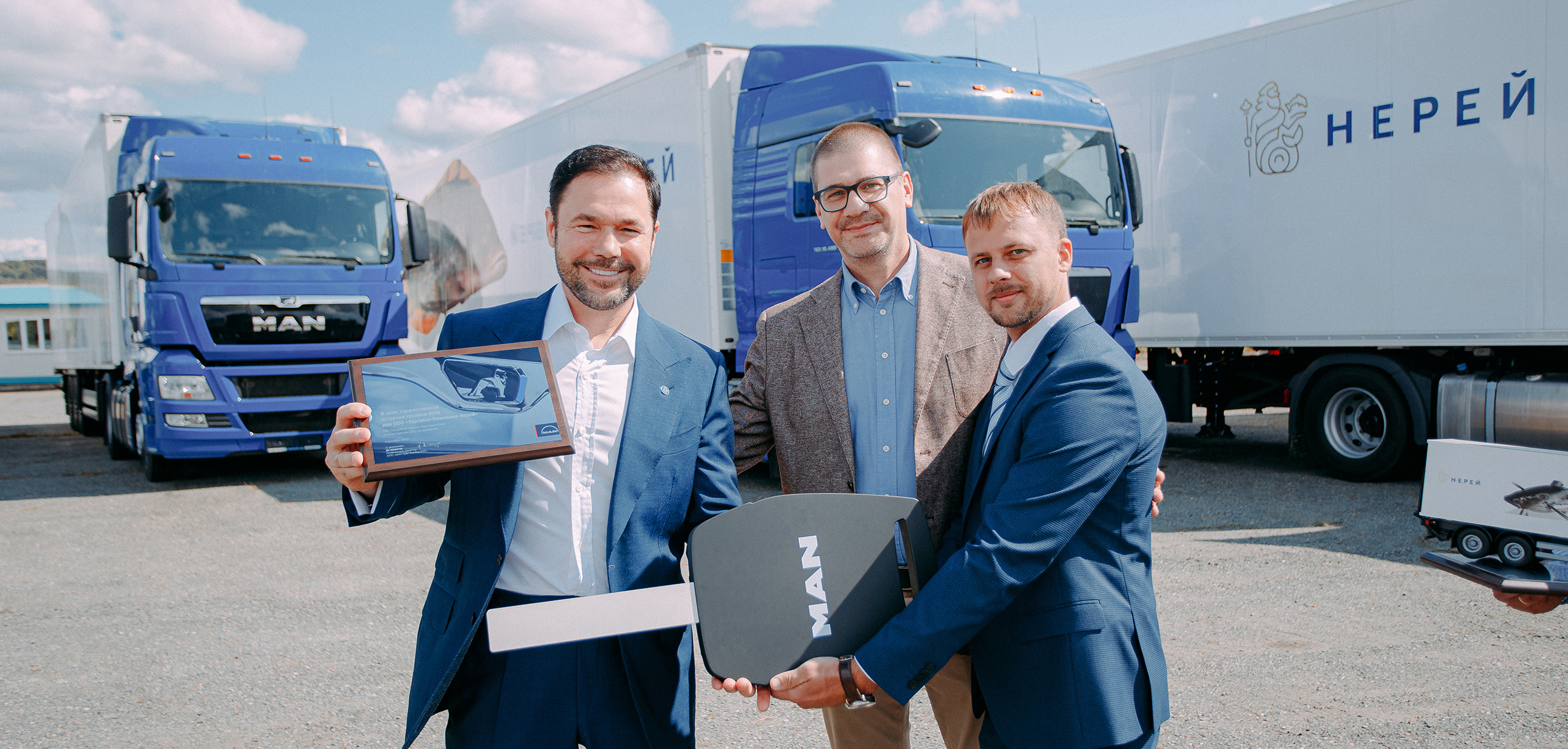 Изюминкой мероприятия стала торжественная передача генеральному директору ООО ТК “НЕРЕЙ” символического ключа зажигания от MAN.