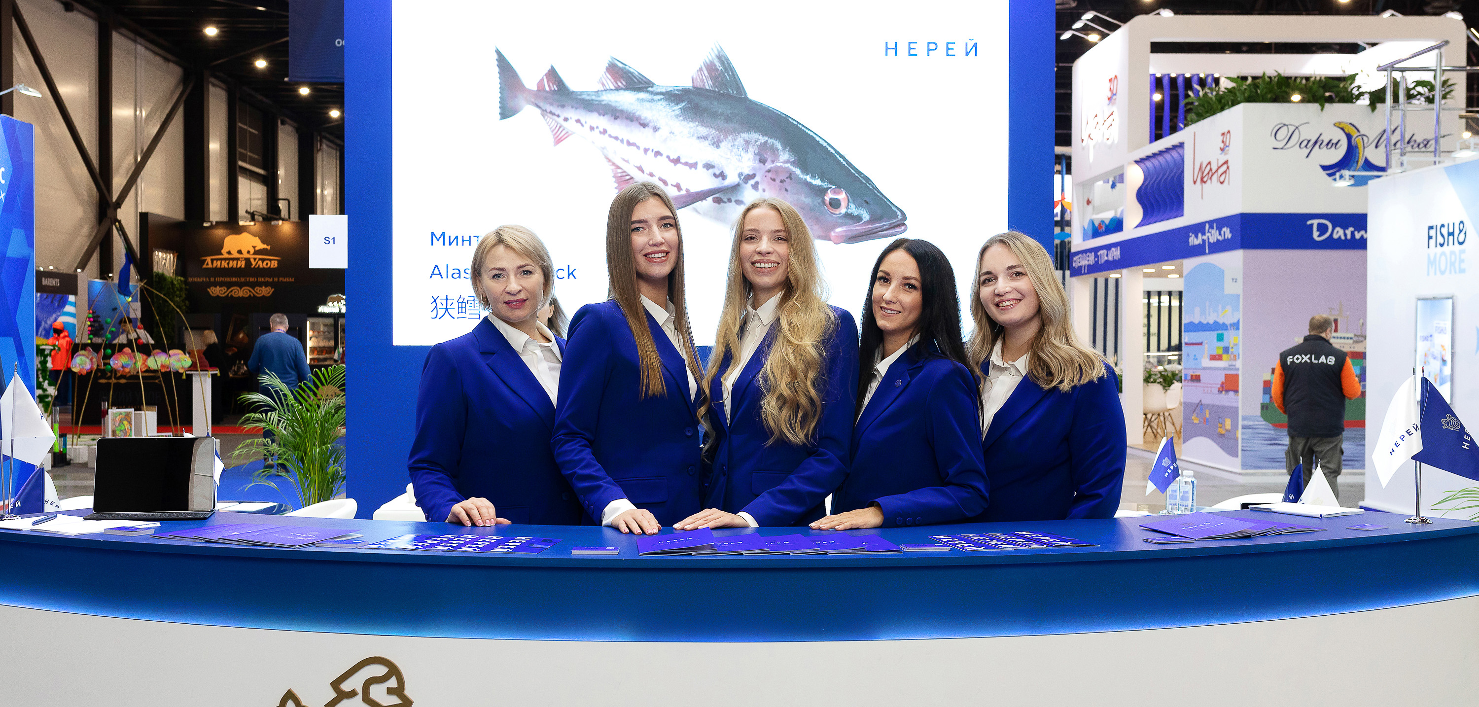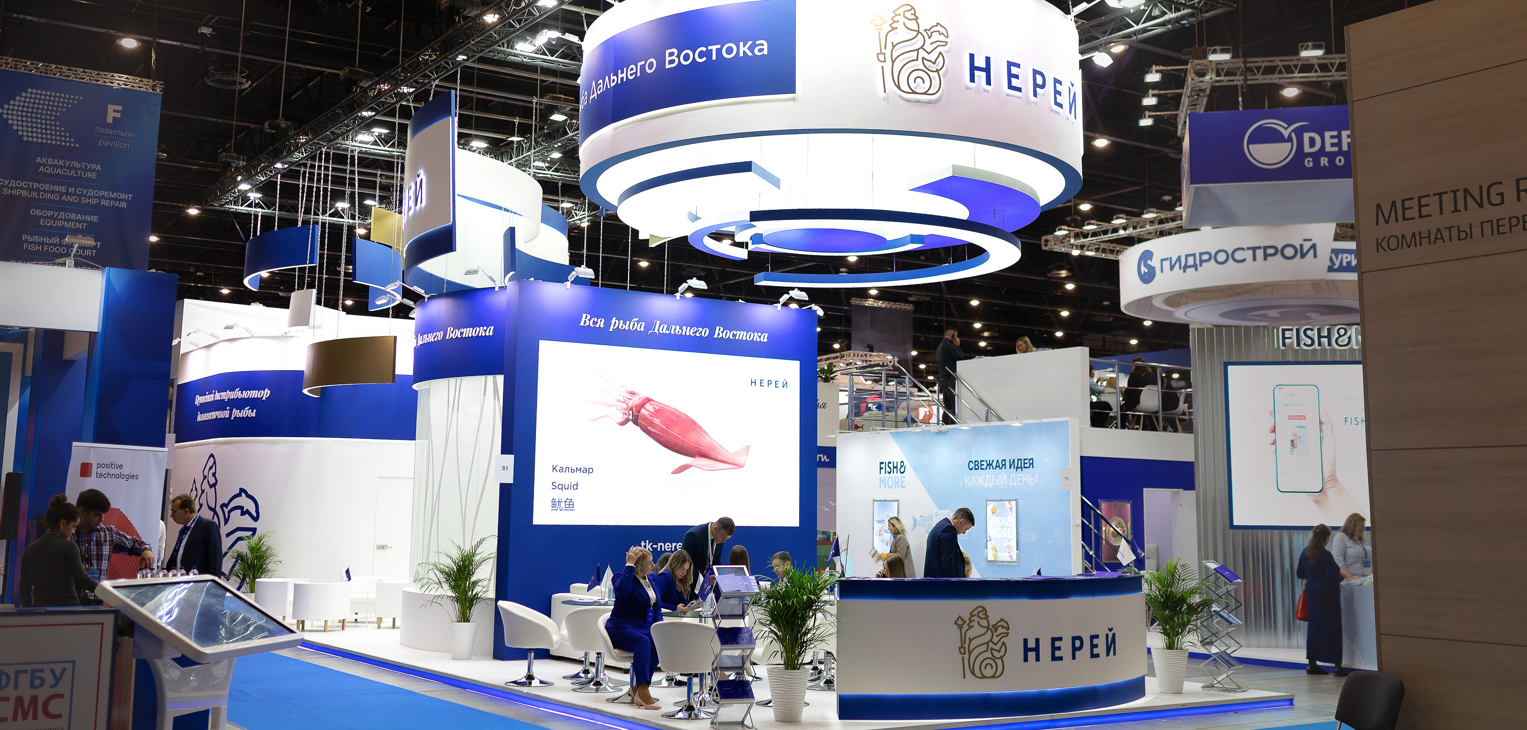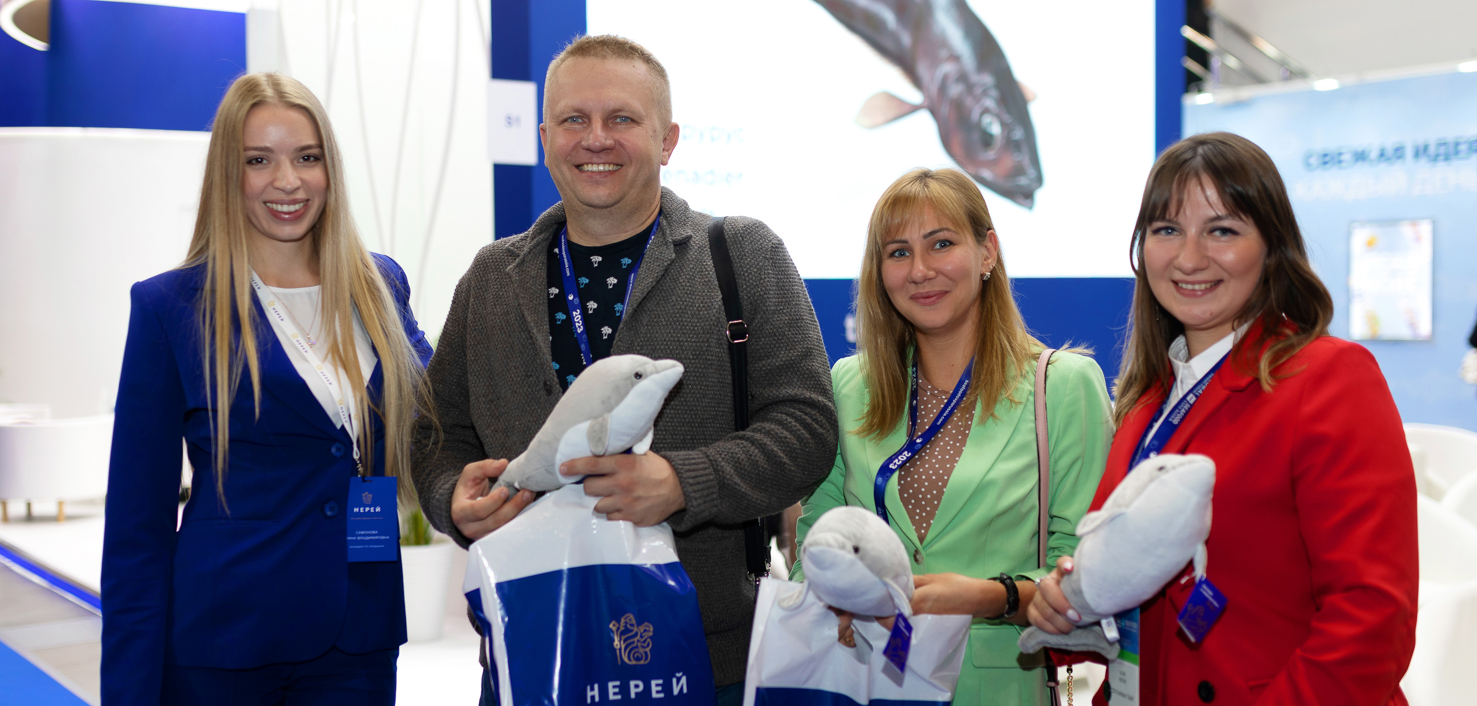 Компания «Нерей» к выставке готовилась основательно и тщательно. Почти год заняли подготовительные работы. С особым трепетом разрабатывался визуальный концепт для столь важного мероприятия. Нереевский стиль узнаваем и уникален, тем не мнее хотелось порадовать и удивить гостей выставки чем-то новым. Самые сильные впечатления произвел наш красивый стенд, который своими очертаниями и конструкцией напоминает многим огромный бело-синий корабль, где есть и палуба, и нос, и капитанский мостик. Светящаяся подвесная конструкция с логотипом и девизом компании просматривалась со всех точек выставочного зала. Точкой притяжения стали и наши анимированные рыбы на большом экране. Их снимали на камеры, с ними фотографировались, ими просто любовались, повторяя одну фразу, ну как живые!