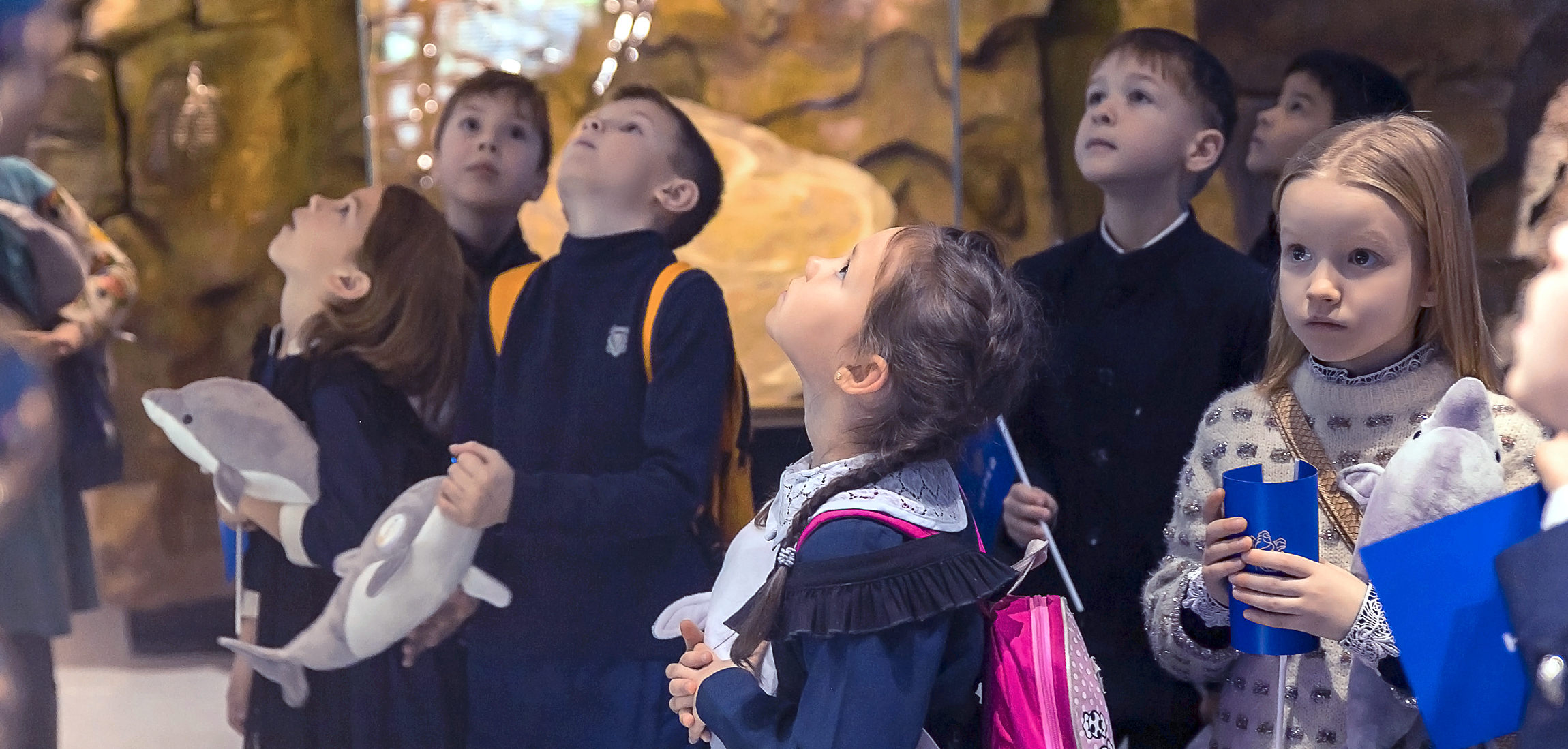 Когда настало время экскурсии, сотрудники Океанариума разделили участников на три большие группы. Для каждой был предусмотрен свой маршрут и программа, соответствующая возрасту наших гимназистов. Затем вместе с опытными гидами дети отправились в настоящее путешествие во времени. Они увидели то, как зарождалась жизнь на нашей планете и узнали, откуда на Земле появились первые млекопитающие. Дети были потрясены тем, какой невероятной величины создания обитали под толщей воды! Одно дело, читать об этом, и совсем другое - видеть своими глазами: макеты гигантских существ - древних китообразных, плезиозавра, воссозданных в натуральную величину, участники наблюдали с неподдельным удивлением и восхищением в глазах!