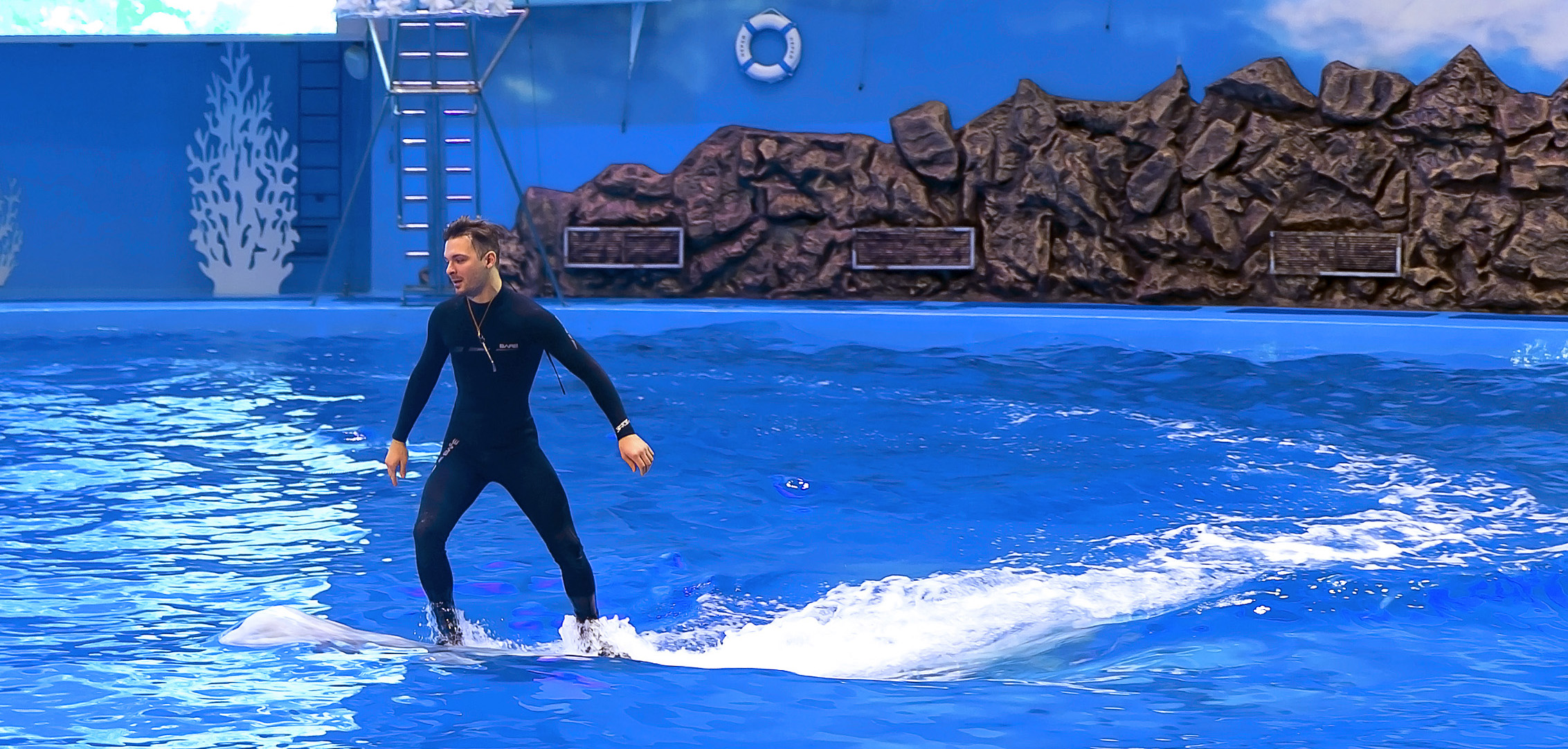 Новая новогодняя программа в дельфинарии вызвала целую бурю детских эмоций! Наши любимые артисты - изящные, умные дельфины танцевали, пели, выполняли сложные акробатические трюки. Дети с замиранием сердца наблюдали, как синхронно, высоко над поверхностью воды взмывают в воздух эти довольно массивные и такие удивительные морские млекопитающие. А мы не могли сдержать восторга, когда видели детские улыбки и счастливые лица наших ста детей на большом экране дельфинария! Выступление дельфинов было волшебным и безукоризненным. А вот морж Миша в этот раз немного продемонстрировал свой характер - он решил, что вместо того, чтобы выполнять команды тренера, ему лучше просто поплавать в бассейне, зато сделать это величаво и грациозно! Впрочем, это нисколько не расстроило детей, а даже наоборот: Миша настоящая личность, звезда с характером, его принимают и обожают именно таким! Дети были счастливы, и мы вместе с ними.