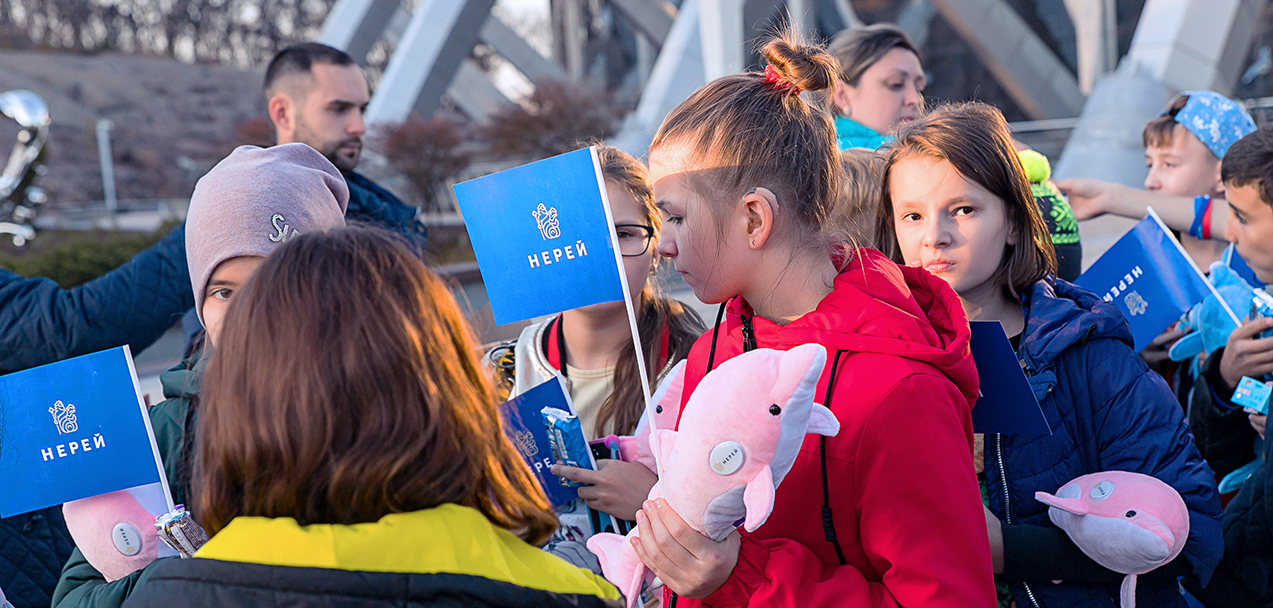 На память об этом волшебном дне у наших новых маленьких друзей остались фирменные браслеты “Я люблю НЕРЕЙ” и мягкие игрушечные дельфины розового и голубого цвета. А у нас самих - очень трогательные фотографии, эмоциональное видео и ощущение счастья, которое вдохновляет нас на новые добрые дела.