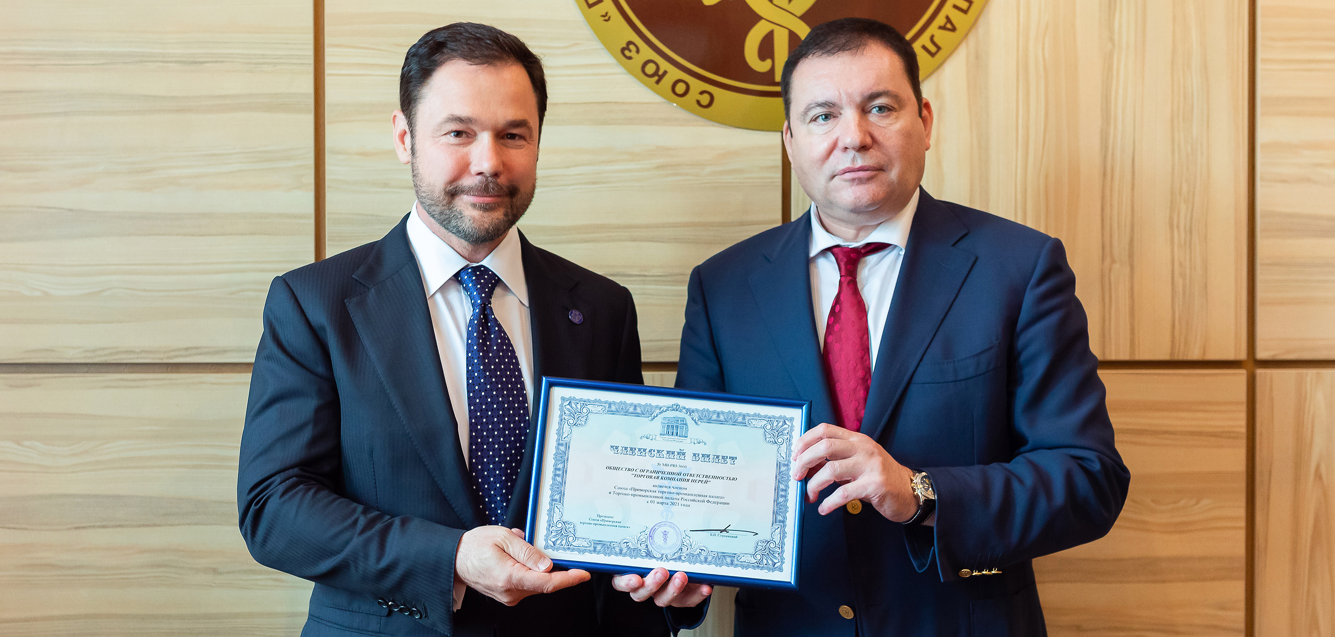 Президент Союза «Приморская торгово-промышленная палата» Борис Ступницкий вручил членский билет генеральному директору компании «Нерей» Андрею Забуге. Вступление в Приморскую палату крупнейшего дистрибьютора дальневосточной рыбы единогласным решением одобрено Советом краевого бизнес-объединения.