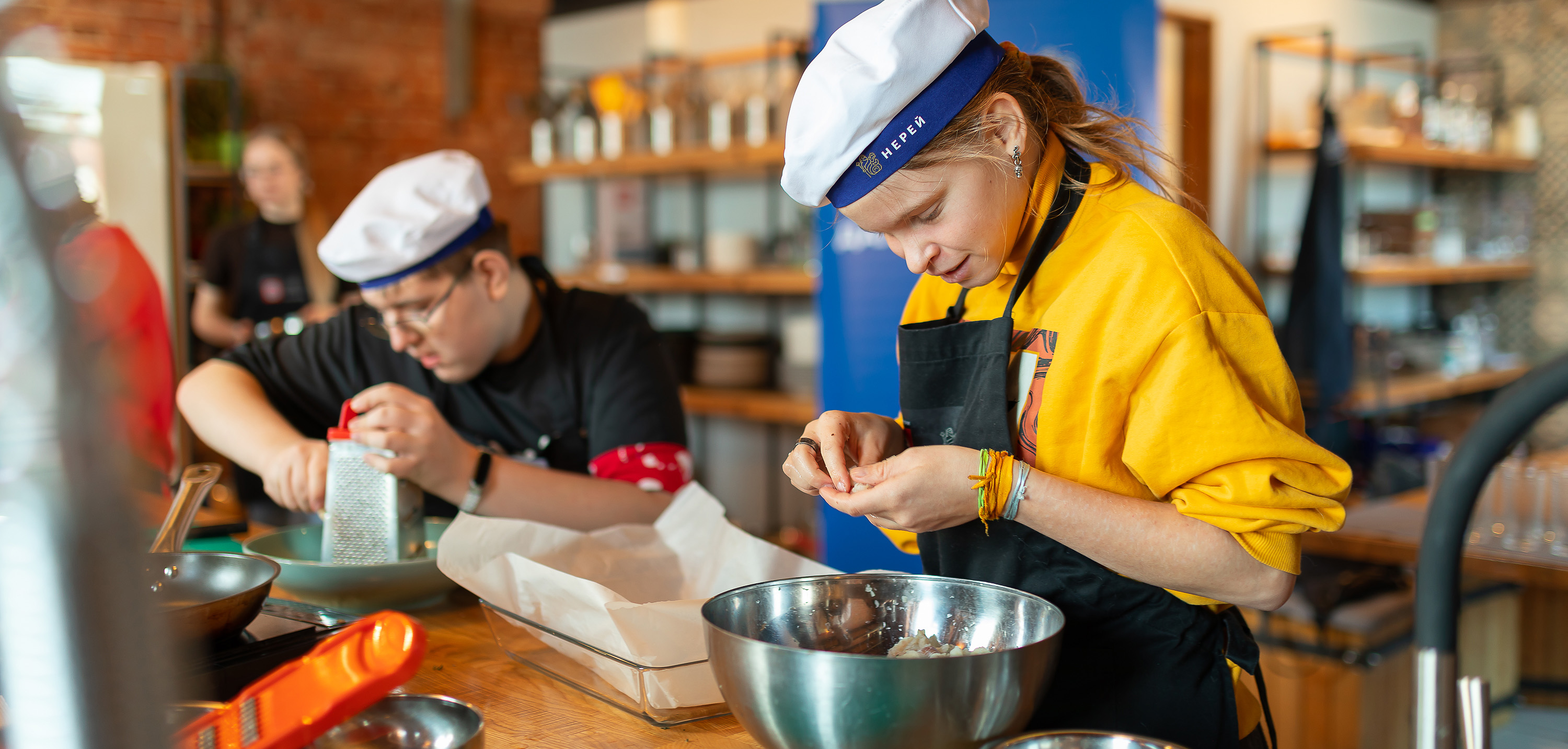 Работа закипела сразу на двух кухнях. Что очевидно бросилось в глаза, как мастерски ребята справлялись с готовкой. Умело чистили кальмар, нарезали рыбу идеальными кубиками, уверенно стояли у плиты, со знанием дела готовили соусы и гарниры. Казалось, им уже и наставники не особо нужны, так ловко и легко у ребят все получалось. А ведь в самом начале проекта участники проявляли невероятную робость, некоторые, казалось, и кухонный нож впервые держали в руках.